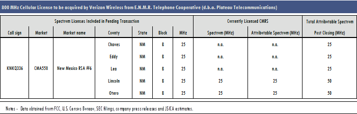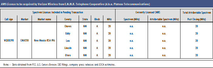 The wireless assets acquired from ENMR serve a rural, 21.6k square foot section of New Mexico with a population of approximately 268k. Verizon will obtain the coop’s GSM operations, licenses and spectrum within New Mexico RSA 6, a market that includes the counties of Chaves, Eddy, Lea, Lincoln and Otero.