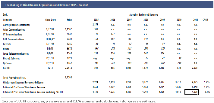 So, I built a chart showing the historic revenue of all of the piece parts that now comprise Windstream. Several of the companies acquired by Windstream were public, and for the four that weren’t I’ve done estimates based on data provided with deal announcements and closing announcements. These estimates may not be perfect, but the trend that we see overall is, in my view, verifiable: Windstream’s acquisitions have not actually led to measurable growth in the top line on a pro forma basis. In fact, if you back out PAETEC's very high, also acquisition-fueled growth, the compound annual growth rate for Windstream pro forma is -0.3%.