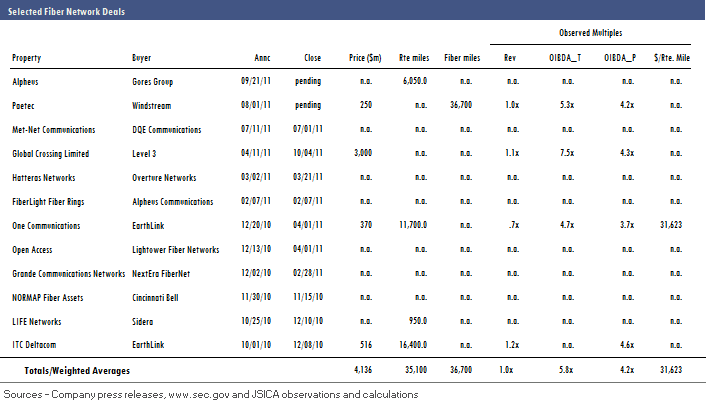 As in most of the deals Windstream has done, management anticipates significant synergies--$100m in operating expenses three years out and another $10m in capital expense savings. Additionally, PAETEC has significant Net Operating Losses that will provide Windstream with a tax shield; the company pegs the net present value of those NOLs at $250m. The company expects to incur about $50m in operating and integration costs in the first year after close and will invest $55m in capex over the first three years of ownership. The deal is expected to close in the first quarter of 2012. Windstream also said that the buy will slightly delever its balance sheet, after synergies, and reiterated its goal of reducing debt to cash flow to 3.2x-3.4x. The company has received $1.1b in financing commitments for the deal and noted that its present dividend of $1/year will be maintained.