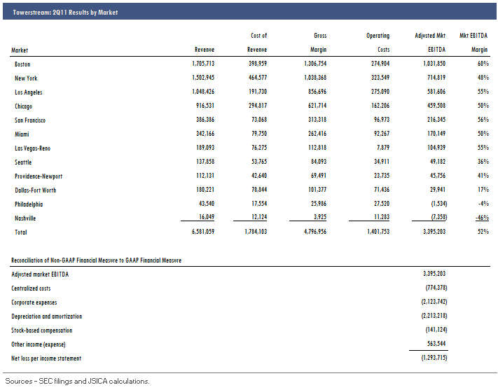 Arguably, Towerstream is still in ramp-up mode, which justifies the relatively high trading multiple. The company has posted little in the way of positive cash flow over the past year, but is still actively seeking and building acquisition markets. At the end of 2Q11, Towerstream was serving an estimated 3,200 business customers with its fixed wireless solution, in a dozen markets.