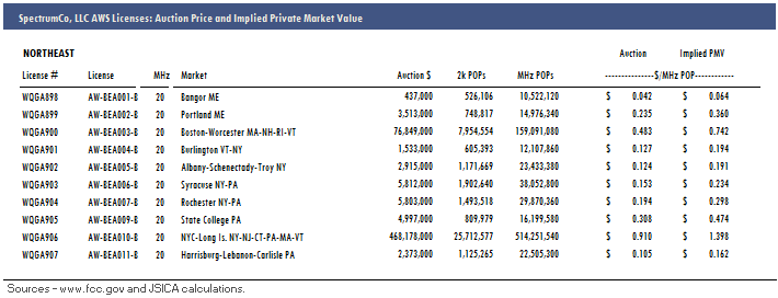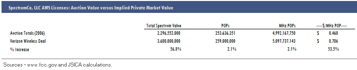 In the $204m deal for Chicago, Leap is paying nearly 34% more than Verizon spent at auction in 2008, or $1.58/MHz POP. Verizon paid $152.5m for that license.