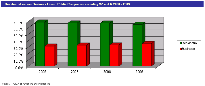 Next we had a look at the public companies excluding the RBOCs. The eight remaining public companies reported that business lines accounted for 31% of total lines in 2006; by 2009 that figure had grown to 35%.