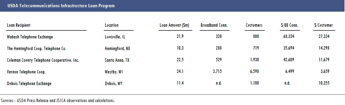The dollar amounts to be invested in broadband per customer for this round of infrastructure projects bears out Adelstein’s point. Wabash, which serves only 320 Internet customers, will spend $68k per customer to complete its fiber build, followed by Coleman County at $42k and the Hemingford Coop. at $36k per customer. The Vernon Coop, serving by comparison a metropolis of 3.7k Internet customers, will still invest $6.5k per customer to connect Westby, WI with broadband. The payback for most of these projects is at least a few generations down the road—if that.