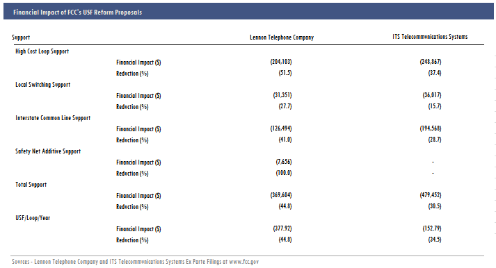 Both Lennon and ITS provided “impact statements” showing probable financial losses to the companies as a result of reducing High Cost Loop Support, Local Switching Support, Interstate Common Line Support, and Safety Net Additive Support. As you can see in the chart below, these two companies stand to lose approximately 30-45% of their annual total universal service support if the FCC’s NPRM proposals are implemented: