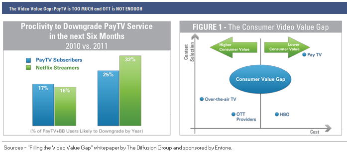 TDG says that, “The consumer value gap exists for consumers who want more than just OTT video, and yet do not attribute full value to premium PayTV services.” I’ve railed against my cable company and threatened to cancel service repeatedly for this reason—I have hundreds and hundreds of channels and nothing to watch. But because I like the ability to DVR the handful of shows I do like, and VOD service for movies, I have yet to follow through on my threats. Still watching my options, however…