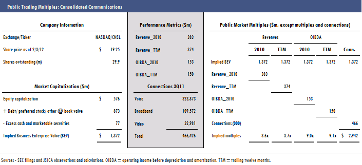 While Consolidated spent 2011 focusing on cost cutting efforts to maintain profitability, SureWest invested in growth initiatives, spending $64m, or 25% of revenues, to expand its fiber network and to increase wireless backhaul capacity. Looking back even further to the years 2008-2010, SureWest has consistently spent over 20% of its top line on fiber related investments. The company invested a high of $86.5m during 2008, a year in which SureWest closed on its $173m acquisition of Everest Broadband, establishing its fiber footprint in Kansas City. With SureWest positioned for future growth in its broadband services, the deal’s forward looking multiples appear favorable for Consolidated.