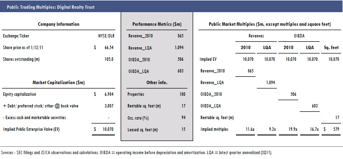 While location plays a large factor into the price that buyers such as Digital Realty are willing to pay for data centers, the driving force behind the rent revenues generated by properties are the services demanded by the lessees. Digital Realty’s top of the line “turn-key data center” product, which offers customers dedicated, managed suites with no shared infrastructure with other clients, commands approximately $180 in annual rent revenue per square foot. At the opposite end of the spectrum, its “powered base building” product, which essentially provides customers with the bare-bones facilities in which to develop their own data centers, generates around $20 per square foot in annual rental revenue.