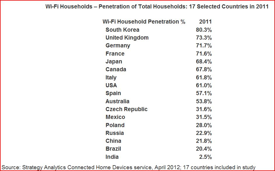 According to new research from the Strategy Analytics, by the end of 2011, 439 million households worldwide had installed home Wi-Fi networks, equivalent to 25 percent of all households. This report predicts that the total worldwide number of Wi-Fi households will reach nearly 800 million in 2016, a penetration rate of 42 percent.