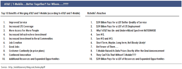 Fact is, this deal never made sense to me, not even for AT&T. $39b is a huge price to pay for a company that is losing market share, is spectrum constrained and behind in real 4G deployment (despite T-Mobile’s unabashed use of the term in its marketing since last fall). At the web site set up by the two to promote the benefits of the deal, www.mobilizeeverything.com, the company lists the “Top Ten” reasons to support the deal. In the chart below, I’ve given my gut-reaction to each point (never mind the fact that several of the ten reasons are really the same thing):