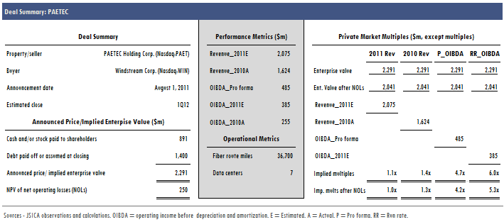 Under the terms of the deal, PAETEC shareholders will receive 0.460 shares of Windstream common stock for each PAETEC share owned. Windstream expects to issue approximately 73m shares of stock valued at approximately $891m, based on its closing stock price on July 29, 2011. Windstream also will assume or refinance PAETEC's net debt of approximately $1.4b. PAETEC stockholders are expected to own approximately 13% of the combined company at close, and the deal has been approved by the boards of directors of both companies.