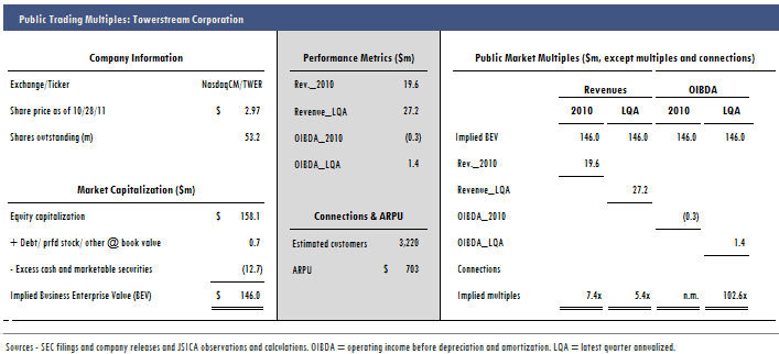 Arguably, Towerstream is still in ramp-up mode, which justifies the relatively high trading multiple. The company has posted little in the way of positive cash flow over the past year, but is still actively seeking and building acquisition markets. At the end of 2Q11, Towerstream was serving an estimated 3,200 business customers with its fixed wireless solution, in a dozen markets.