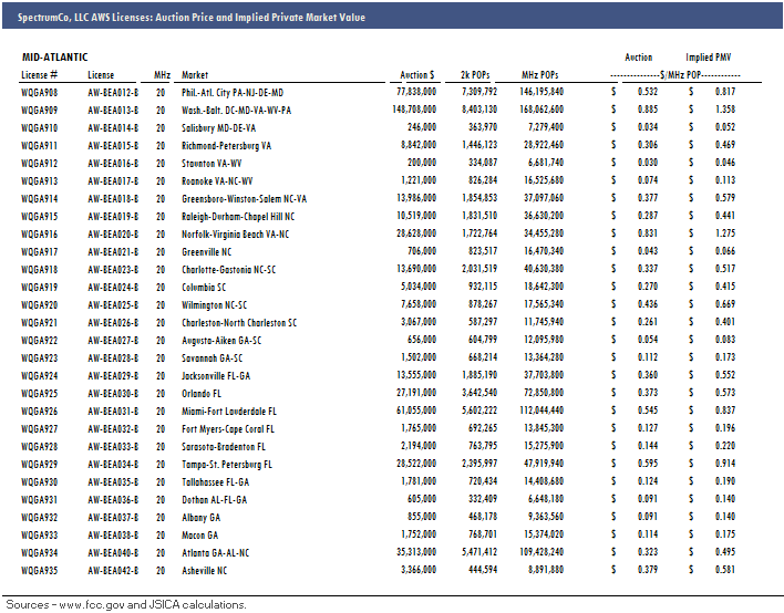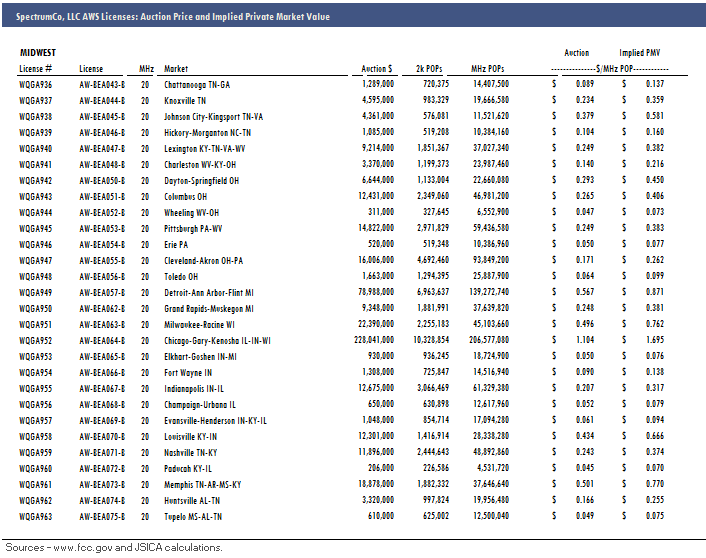 In the $204m deal for Chicago, Leap is paying nearly 34% more than Verizon spent at auction in 2008, or $1.58/MHz POP. Verizon paid $152.5m for that license.