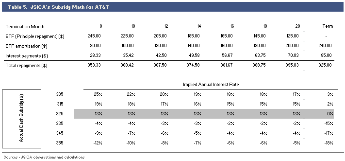 Looking back at the implied subsidies I calculated in Part 2 of this series, AT&T and VzW would like consumers to think that the subsidies are generous and in many cases exceed the amount of the ETF. While subsidies are large, it is unlikely that on average, actual cash subsidies exceed the ETF for either company. Because of this, I calculate the implied interest rates assuming actual cash subsidies that revolve closely around the AT&T and VzW initial ETF amounts, rather than using the implied subsidy numbers found in Table 1 of Part 2 in this series.