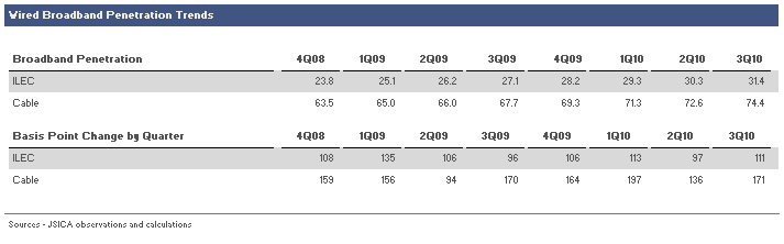 Wired broadband penetration has been creeping higher quarter by quarter, but for the public ILECs that we track, the growth has been modest. In 3Q10, broadband penetration of ILEC access lines rose 111 basis points, to 31.4%. But if you consider that the number of voice lines has been falling each quarter, the “growth” is really minimal. Cable broadband penetration (calculated as broadband connections/ basic cable subscribers) rose 171 basis points, to 74.4% over the same period. Here too, the denominator is shrinking, overstating somewhat the increase in overall broadband customers. The public cable companies have lost more than half a million subscribers in each of the past two quarters.
