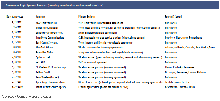 It is possible that LightSquared will overcome the technological and interference challenges that its L-band spectrum faces…it may even be likely. But in my opinion it’s not at all clear that this can happen and then a system be deployed in time for its announced “partners” to effectively compete in the marketplace. In fact, I would venture to say that most of the 14 listed below, including Sprint, were largely hedging their bets when they signed on the dotted line.