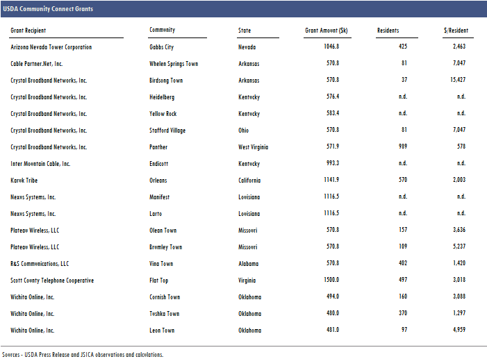 The Community Connect grants are awarded to rural communities of less than 20k citizens that currently lack broadband transmission service. The grant winners—who must match the funds they receive—can either put the funds towards broadband infrastructure or towards a community center than will provide free broadband for its citizens. Eighteen rural communities will benefit from the grants--which ranged from $480k to $1.1m.